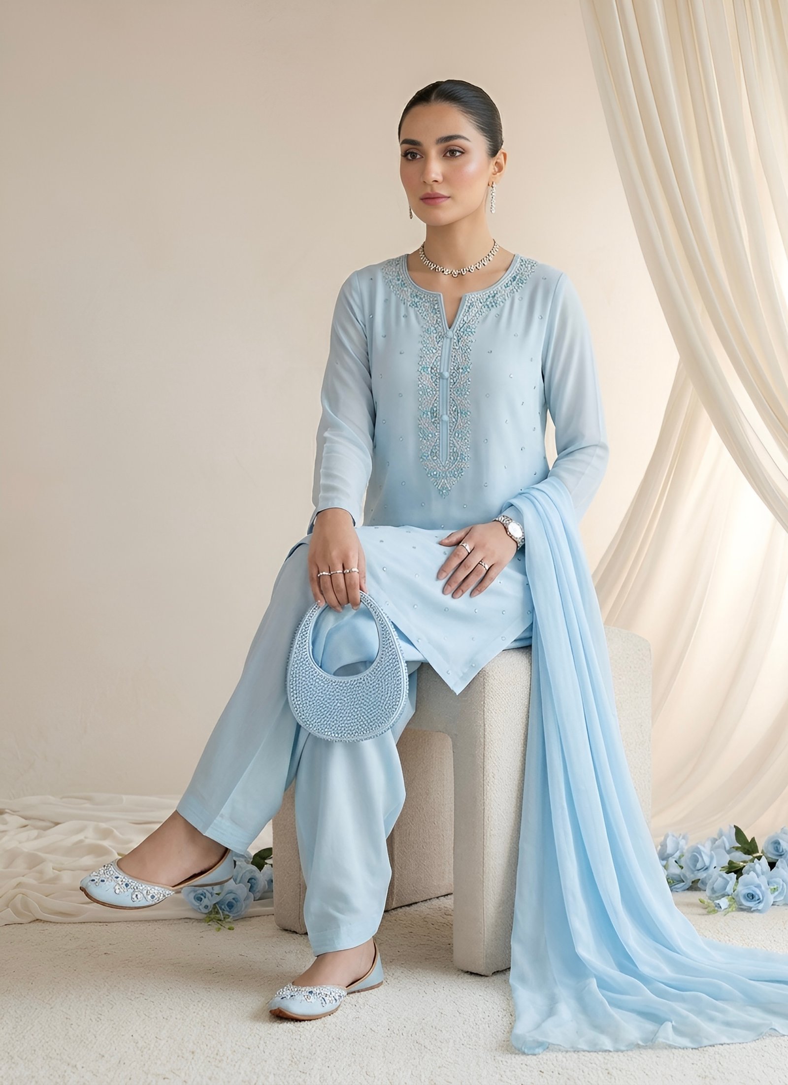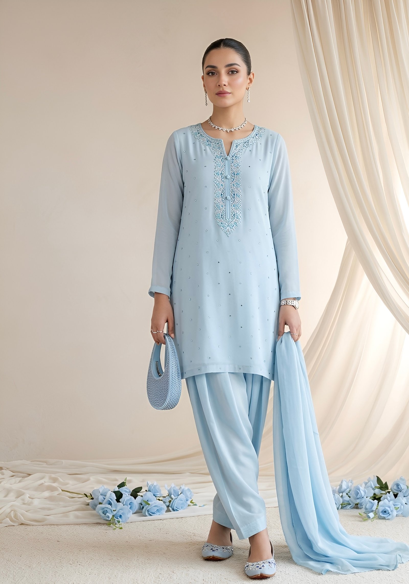 A ice-blue three piece adorned with delicate embroidery and subtle stone shimmer.