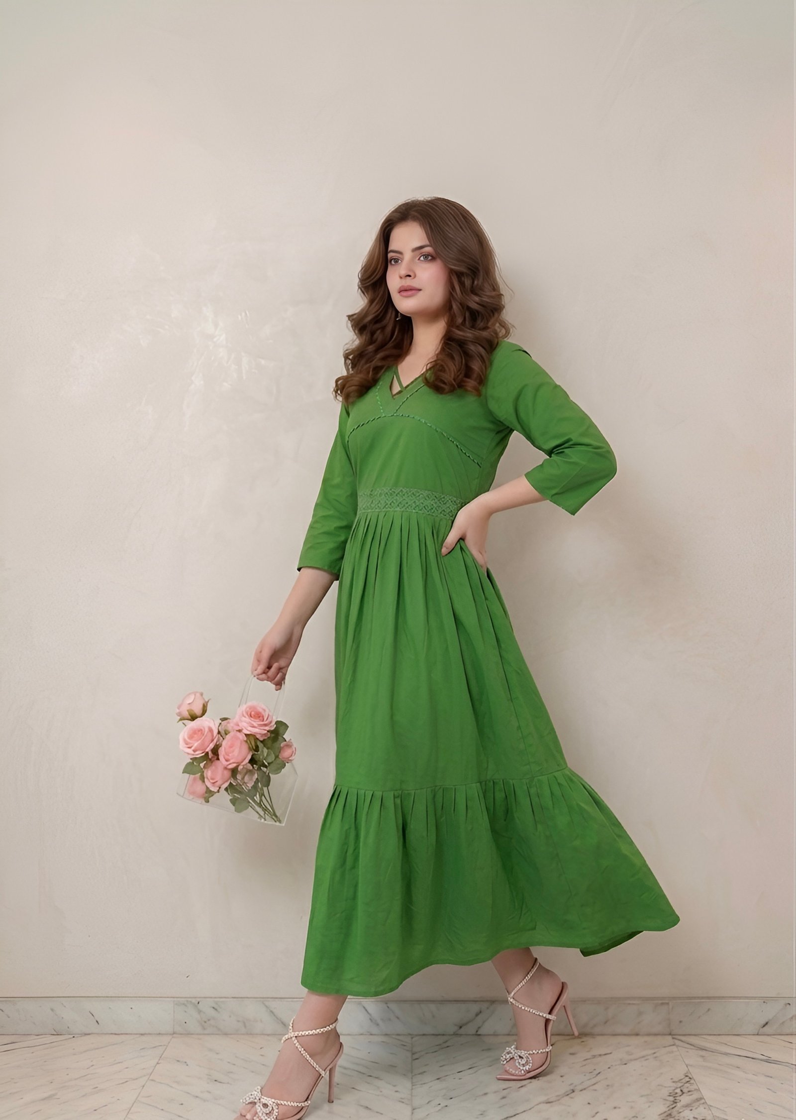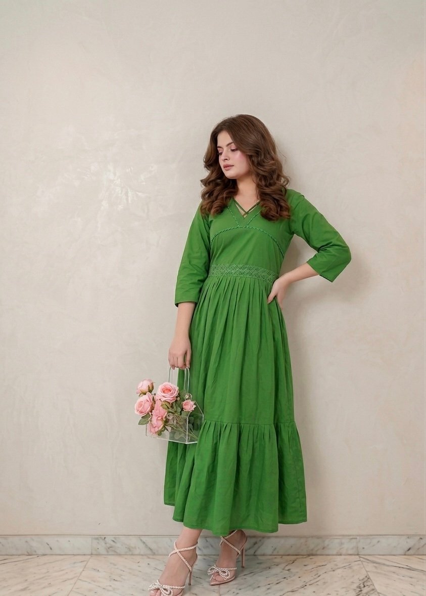 A refreshing green long dress featuring a stylish X-style chic V neckline that adds a modern edge to its elegant look. The soft pleats create a graceful flow, enhancing its flattering silhouette. Made from lightweight fabric, it feels airy and comfortable, making it perfect for summer days. Effortlessly chic, it’s ideal for casual outings while keeping your style refined and easy.