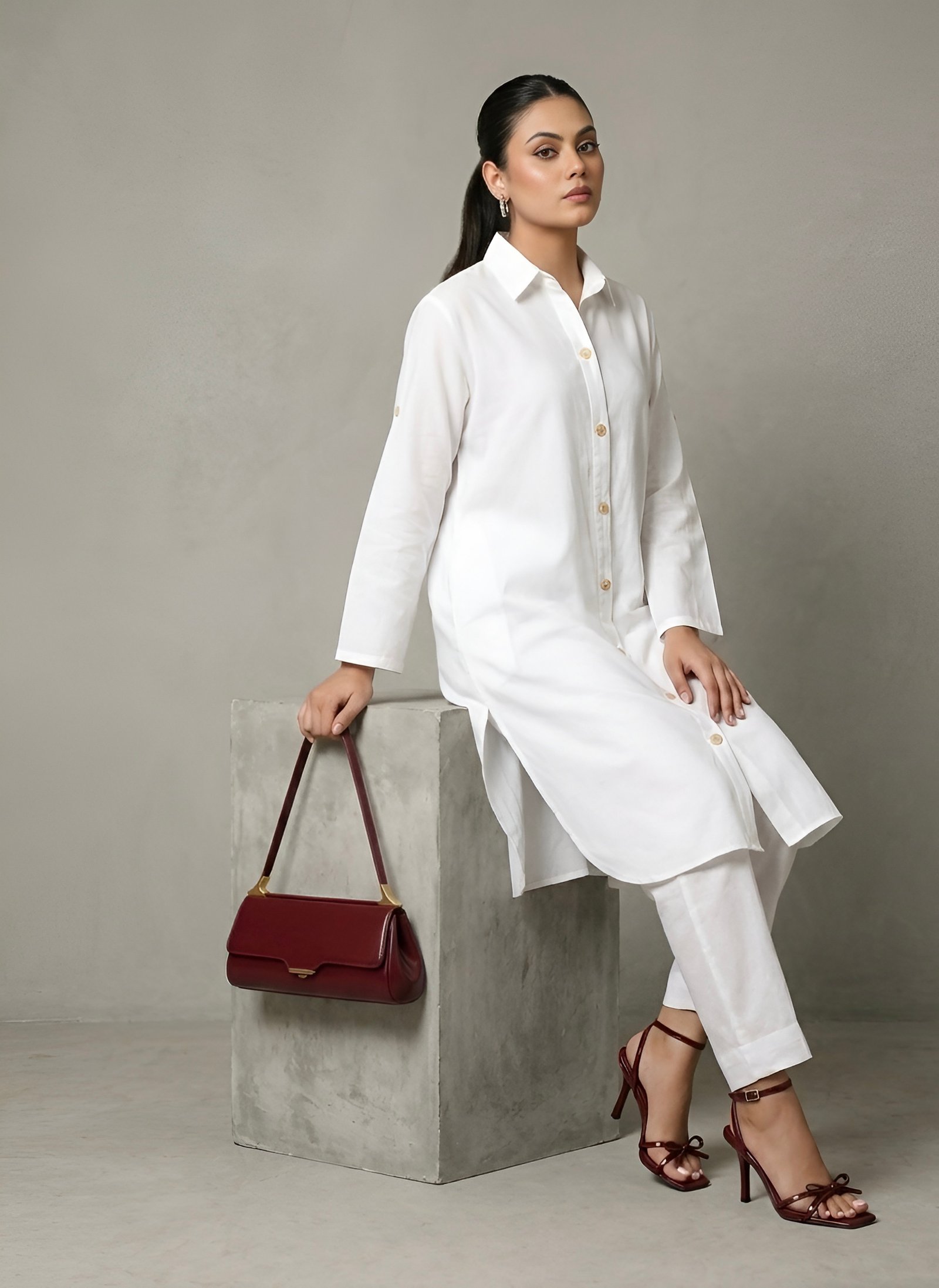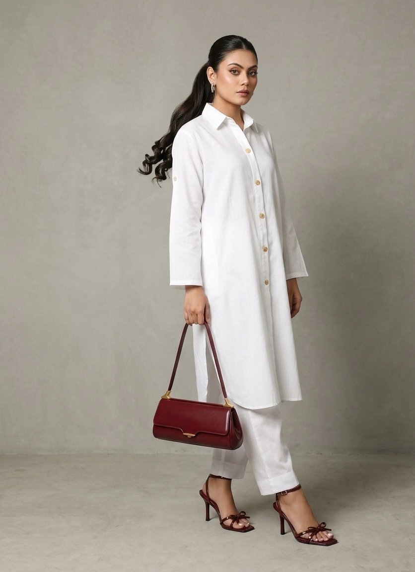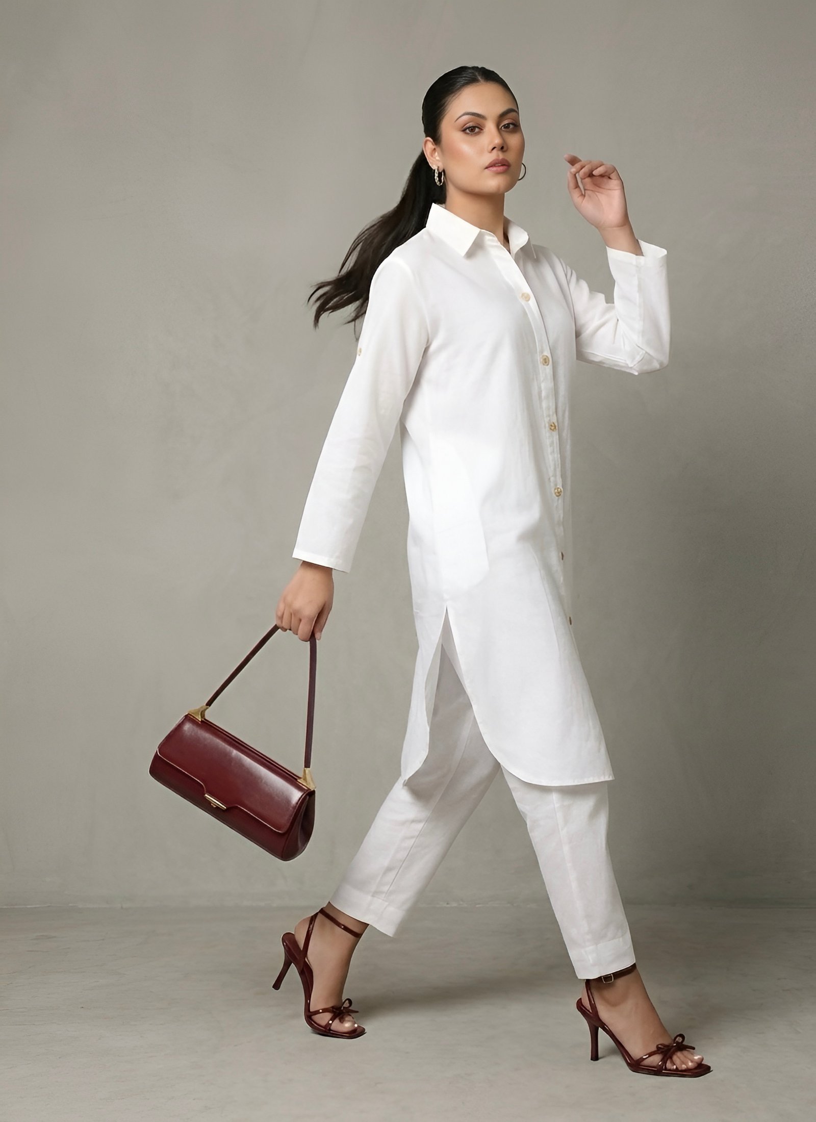 Co-ord set, a sophisticated fusion of traditional craftsmanship. This timeless piece is paired with plain trouser pants that offer a modern, polished silhouettes,